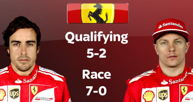 Перед началом сезона в этой паре ожидалось противоборство двух стихий, двух чемпионов мира, "льда" и "пламени". На деле же мы на данный момент замечаем лишь испарину, как бы грустно это не звучало для поклонников Кими. Райкконен, как известно, стал заложником новых правил и пока что не смог к ним приспособиться. Неспроста в Маранелло уже всерьез задумались о рациональности пребывания в команде финна. Будем надеяться, ситуация изменится в лучшую сторону как для команды, так и для Кими