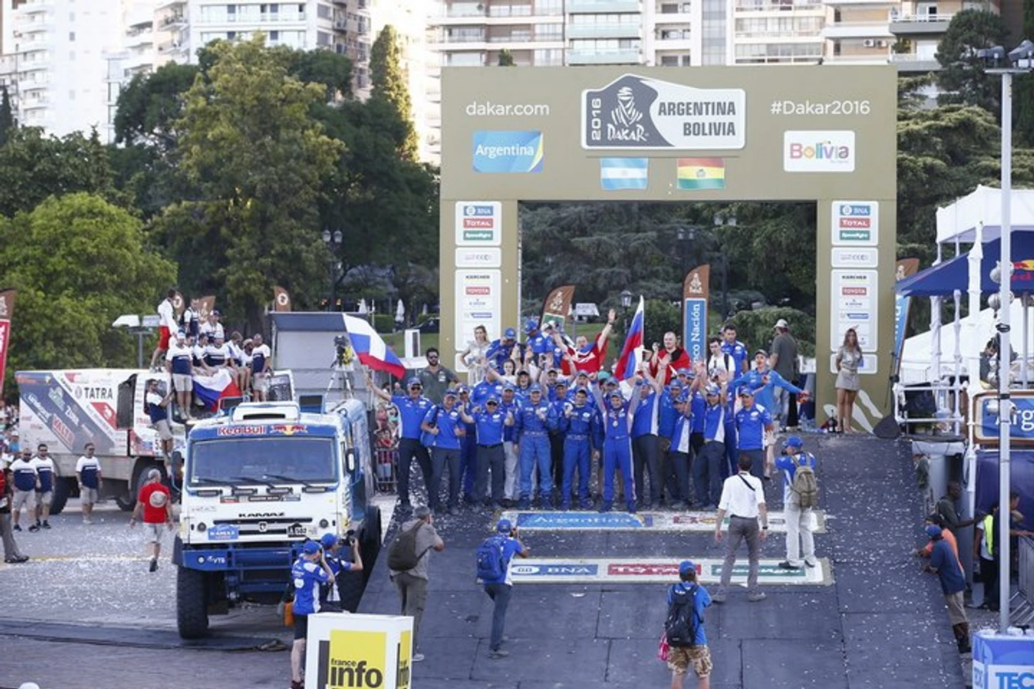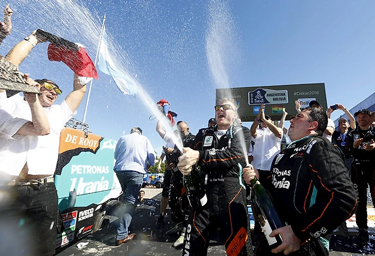 Гонщик Жерар де Рой и штурман Дарек Родевальд празднуют успех в зачете грузовиков.