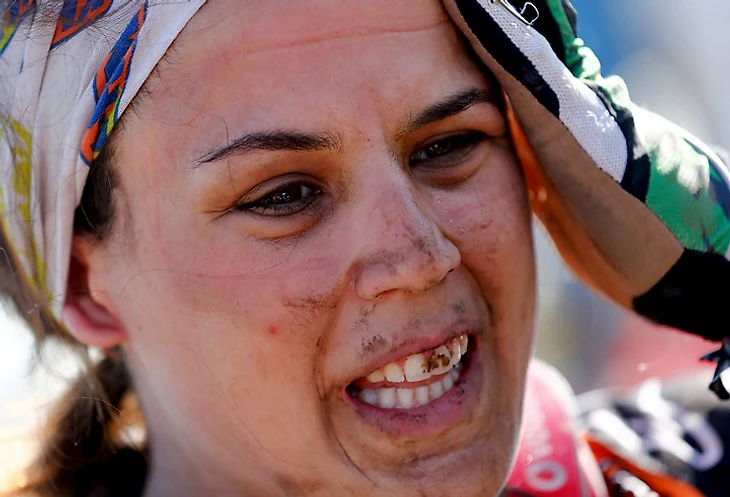 Мотоциклистка Лайа Сайнс радуется долгожданному финишу ралли-рейда.