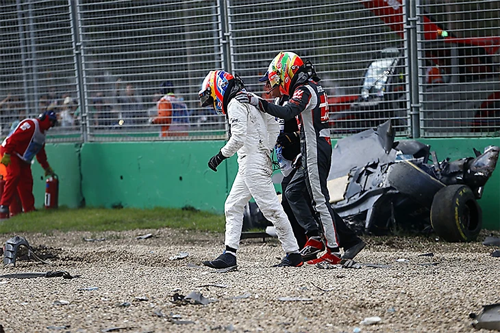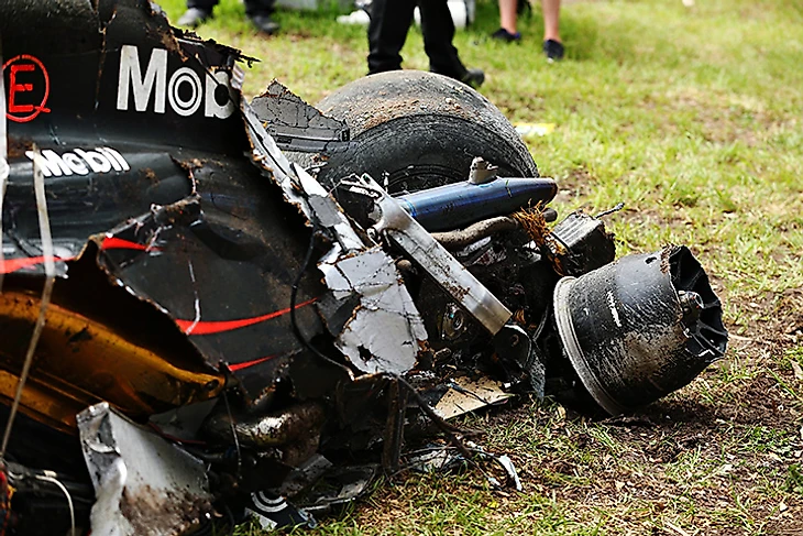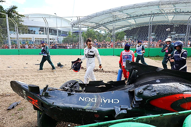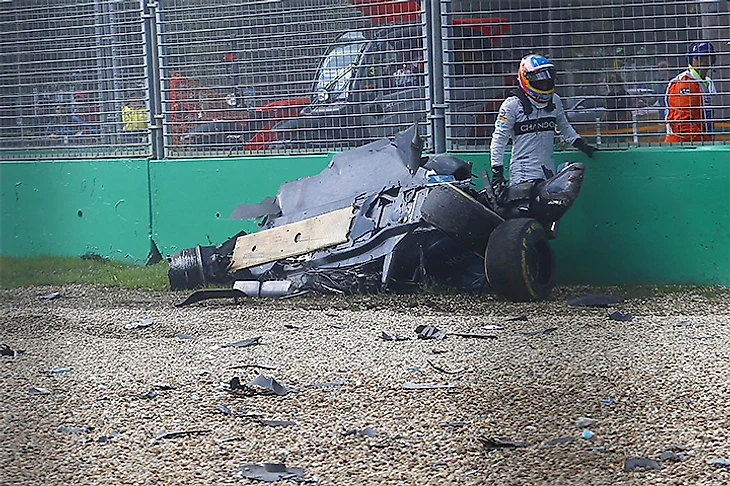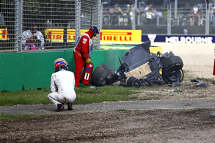 На Гран-при Австралии гонщик «Макларена» Фернандо Алонсо попал в очень страшную на вид аварию. Однако сразу после происшествия выбрался из-под обломков.