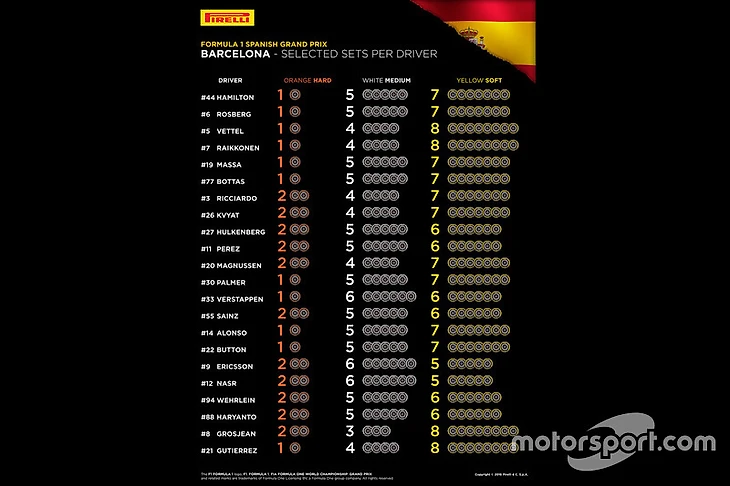 Трасса в Барселоне требует очень высокой прижимной силы, что в совокупности с абразивной поверхностью приводит к большим нагрузкам на шины, особенно на переднее левое колесо. Из-за высокого износа в гонке ожидается много пит-стопов.