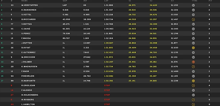 Остается только неясным, почему австралийца держали так долго на трассе. В какой-то момент стало очевидно, что его мягкая резина начала уступать в скорости соперникам - тогда Феттель поехал в боксы, а Даниэль этого не сделал. В этот момент он лишился третьего места, но уж никак не победы - на нее претендовать было бы чрезвычайно сложно, даже получи он новые покрышки одновременно с Себастьяном.