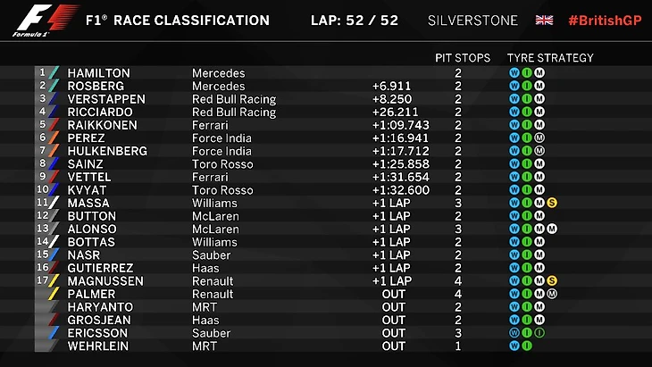 ПК-Хэмильтон(5) ЛК-Хэмильтон НП-Масса 1-Хэмилтон(10) 2-Росберг(5) 3-Риккьярдо(5) 4-Ферстаппен(0) 5-Феттель 6-Райкконен(5) 7-Перес(5) 8-Боттас 9-Хюлькенберг 10-Алонсо