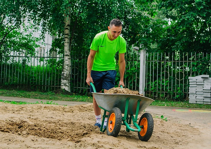 На помощь вышла вся команда, включая и новичков «Строителя». Кому-то сперва даже не хватило перчаток – не беда, работали голыми руками. Копали траншею, подсыпали дно песком (для прочности будущих бордюров), переносили 50-килограммовые блоки по всей территории садика – своеобразные силовые нагрузки, которые по плечам далеко не каждому.