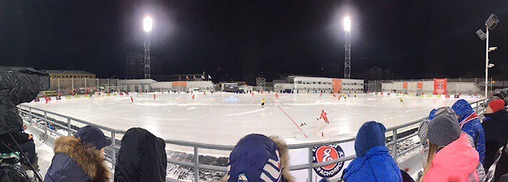 Из фишек на новом стадионе отмечу выход команд. Ярко! И как я понимаю, такой выход в хоккее с мячом встретить редкость.
