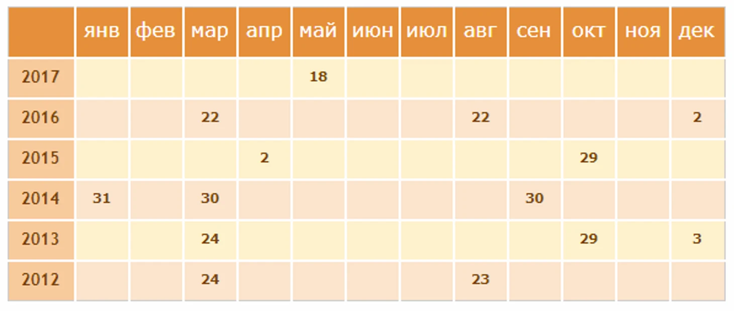 В ФХМР до сегодняшнего дня в последний раз исполком собирался 18 мая прошлого года. Это был так называемый итоговый исполком, который впервые за много лет прошел с таким большим отрывом от дня завершения сезона. Я попытался воссоздать хронику проведения исполкомов за 6 лет и для наглядности разметил данные в таблице - год, месяц, число.