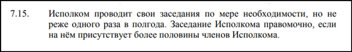 Возможно, кто-то из знатоков возразит, что в августе 2017 года состоялось заочное голосование исполкома и все соблюдается. Но это голосование не может считаться заседанием или заменой заседанию - объясняю почему.