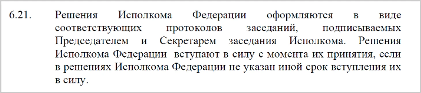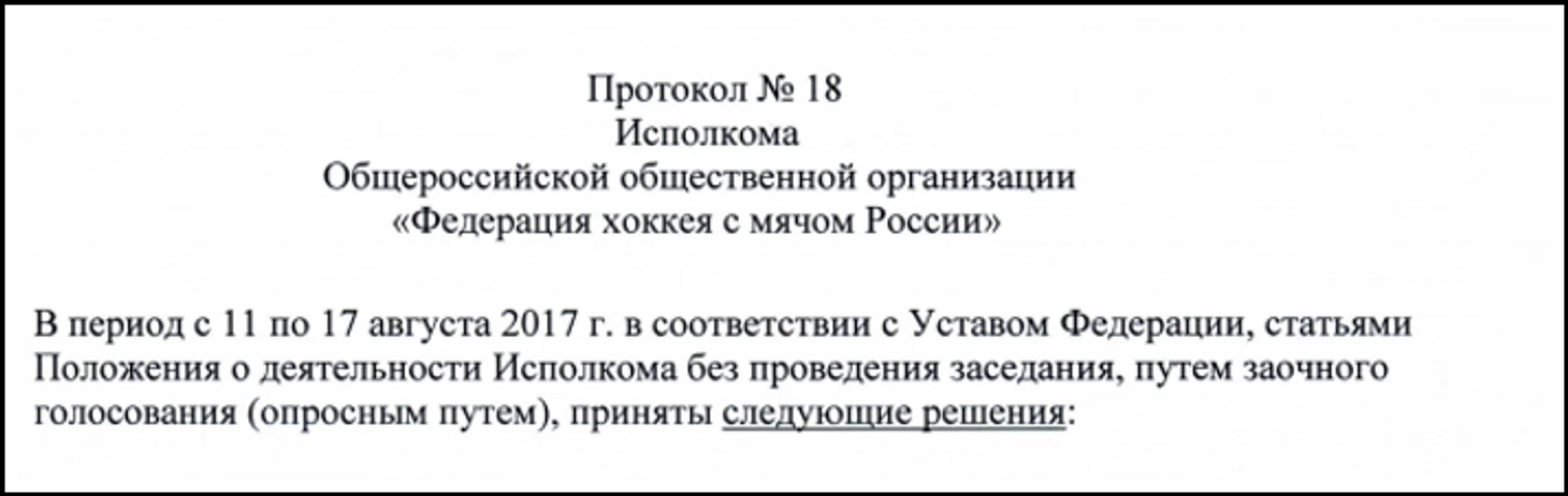 Как уже упоминалось ранее, возможность заочного голосования для принятия решений исполкома была внесена в Устав в сентябре 2016 года. Но пикантность ситуации состоит в том, что заочные голосования проводились и до внесения этих поправок в осноподогающий документ ФХМР.