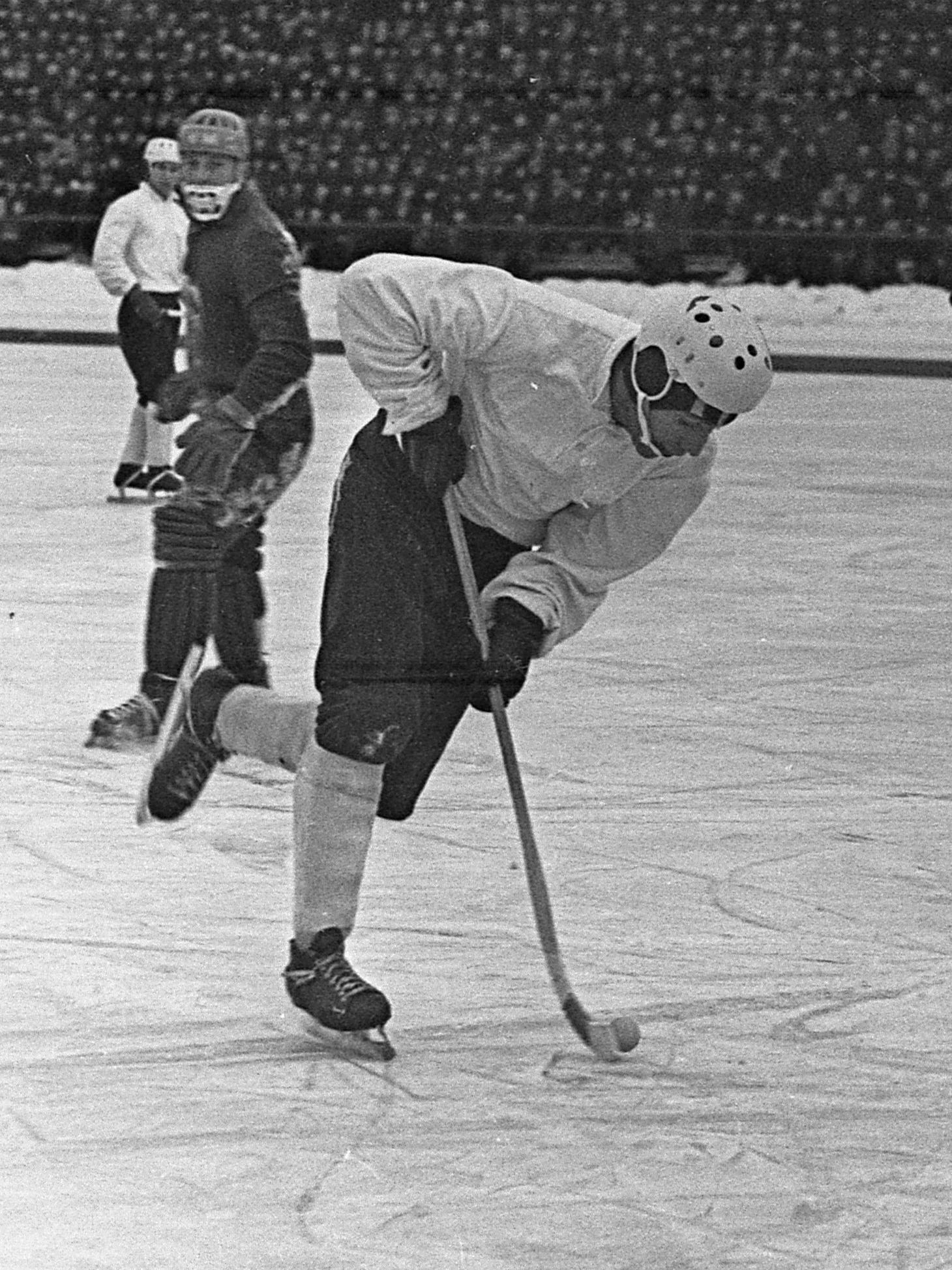 29 ноября 1968. XX чемпионат CCCР по хоккею с мячом. «Локомотив» (Иркутск) — «Динамо» (Москва) — 0:11. Валерий Маслов забивает гол, оставив не у дел вратаря иркутян Геннадия Кривощекова