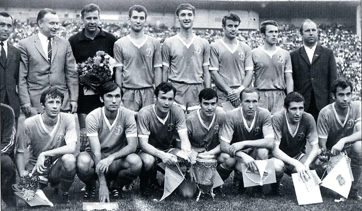 8 августа 1970. Москва, Большая арена стадиона им. В. И. Ленина. «Динамо» (Москва) — обладатель Кубка СССР. Стоят (слева направо): А. С. Голодец (тренер), К. И. Бесков (старший тренер), Л. Яшин, В. Смирнов, В. Уткин, В. Зыков, В. Штапов, В. В. Ильин (тренер). Сидят: Ю. Семин, Ю. Авруцкий, В. Козлов, В. Эштреков, Г. Еврюжихин, В. Маслов, В. Аничкин