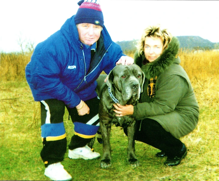 1998. Валерий Маслов с женой Екатериной и мастифом Пантером во время работы в Березниках