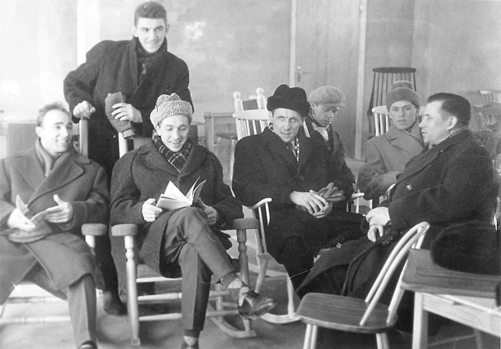 Сборная СССР в аэропорту в ожидании рейса. На фото слева направо: Михаил Осинцев, Вячеслав Соловьев, Евгений Папугин, Анатолий Мельников, Евгений Герасимов, Юрий Варзин, Григорий Петрович Епихин (руководитель делегации)