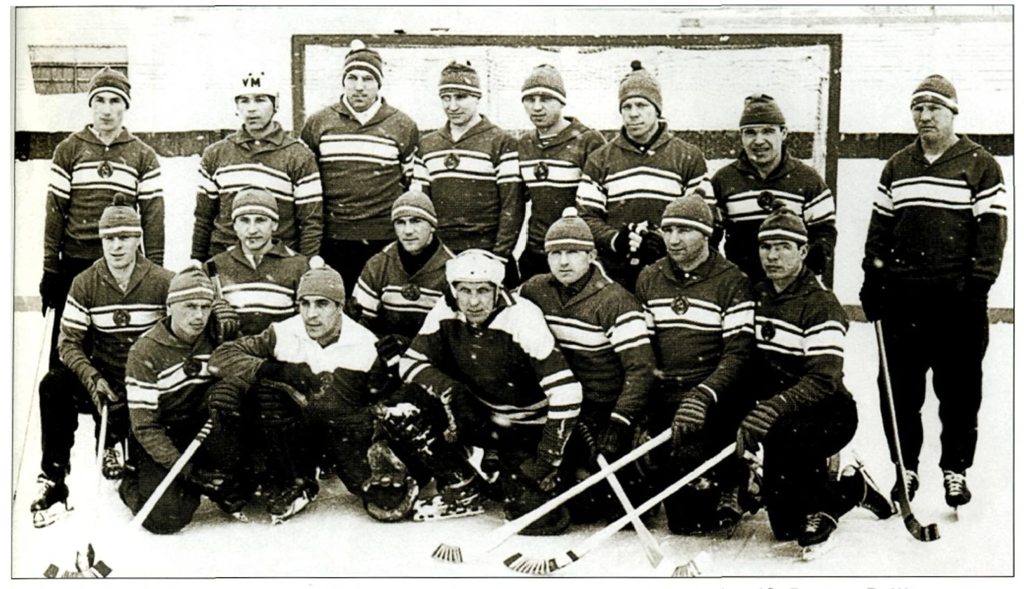 1967. Сборная СССР — чемпион мира. Нижний ряд (слева направо): В. Рыбин, Ю. Варзин, В. Шеховцов, Ю. Школьный, В. Соловьев, А. Мельников, В. Атаманычев, М. Осинцев, В. Хардин. Верхний ряд: Ю. Шорин, В. Данилов, Е. Папугин, В. Маслов, Ю. Афанасьев, Е. Герасимов, Н. Дураков, А. Измоденов