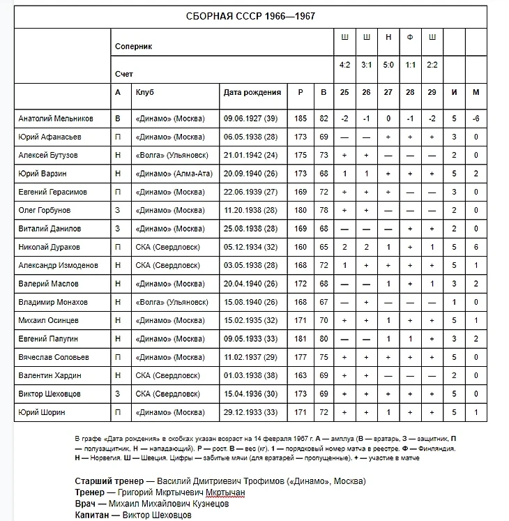 Состав сборной СССР во время товарищеских матчей в Финляндии и Швеции