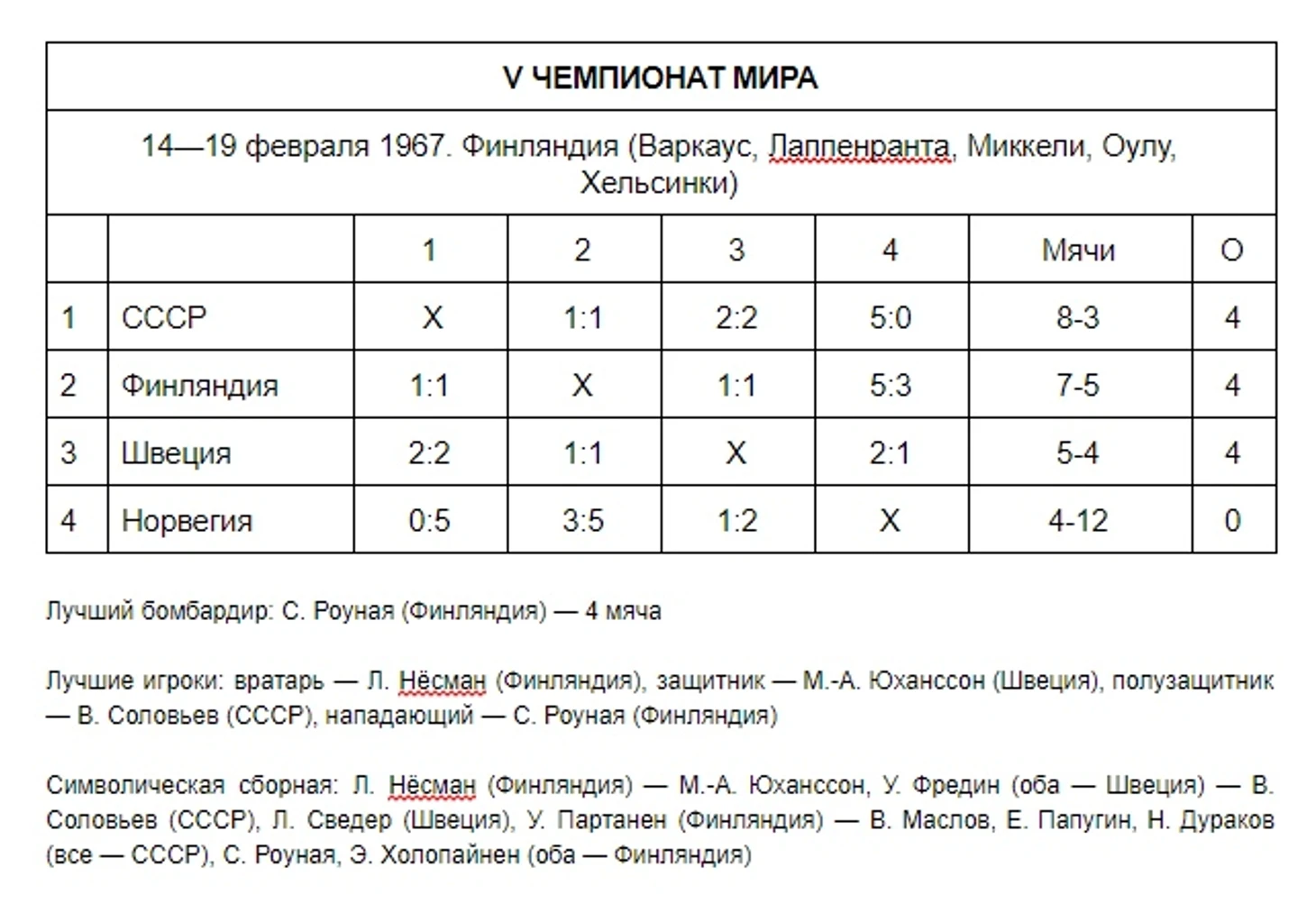 В итоговой таблице возник настоящий финский треугольник: сразу три команды из четырех набрали одинаковое количество очков — по 4. Пришлось считать разницу забитых и пропущенных мячей: у СССР — 8:3, у Финляндии — 7:5, у Швеции — 5:4. Наши опять выиграли золото! Шведы снова не смогли стать даже вторыми...