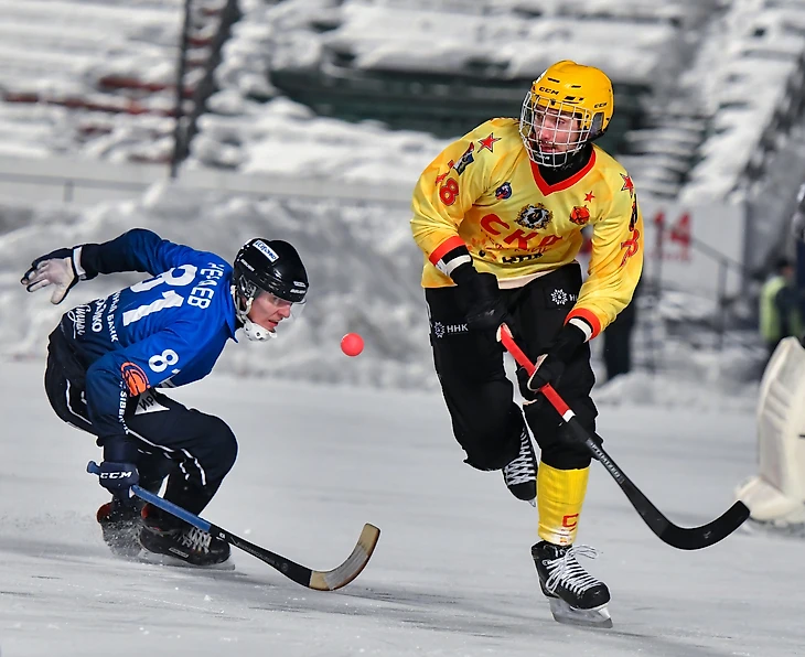 16 марта 2018. Иркутск, стадион «Труд». Третий матч полуфинальной серии XXVI чемпионата России «Байкал-Энергия» — «СКА-Нефтяник» (Хабаровск) — 3:4. Максим Ишкельдин (в желтой форме) проходит полузащитника иркутян Ивана Нечаева