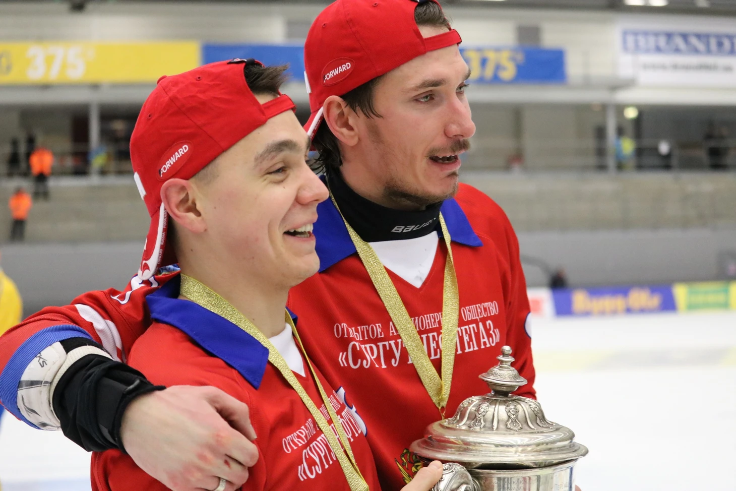 2 февраля 2019. Венерсборг, арена «Венерсборг». Только что сборная России в дополнительное время вырвала победу у сборной Швеции в финальном матче XXXIX чемпионата мира — 6:5. Алмаз Миргазов (слева) и Максим Ишкельдин с Кубком чемпионов мира
