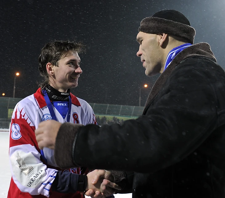 20 декабря 2011. Обухово, стадион СК «Обухово». Юный Максим Ишкельдин и известный боксер и государственный деятель Николай Валуев после окончания финального матча III молодежного чемпионата мира Россия — Швеция