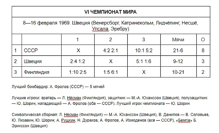 Как и в первом чемпионате мира 12 лет назад, в мировом первенстве — 1969 выступили всего лишь три команды. И на этот раз в привычной компании мы не увидели норвежской сборной, но, в отличие от 1957 года, причины на то были не организационные, а политические. Усеченный состав сподвиг IBF на турнир в два круга, так что впервые чемпионат не уложился в одну неделю. А за три месяца до этого сборную страны впервые увидели в Иркутске. Пусть и в контрольных матчах, но трибуны были полные!