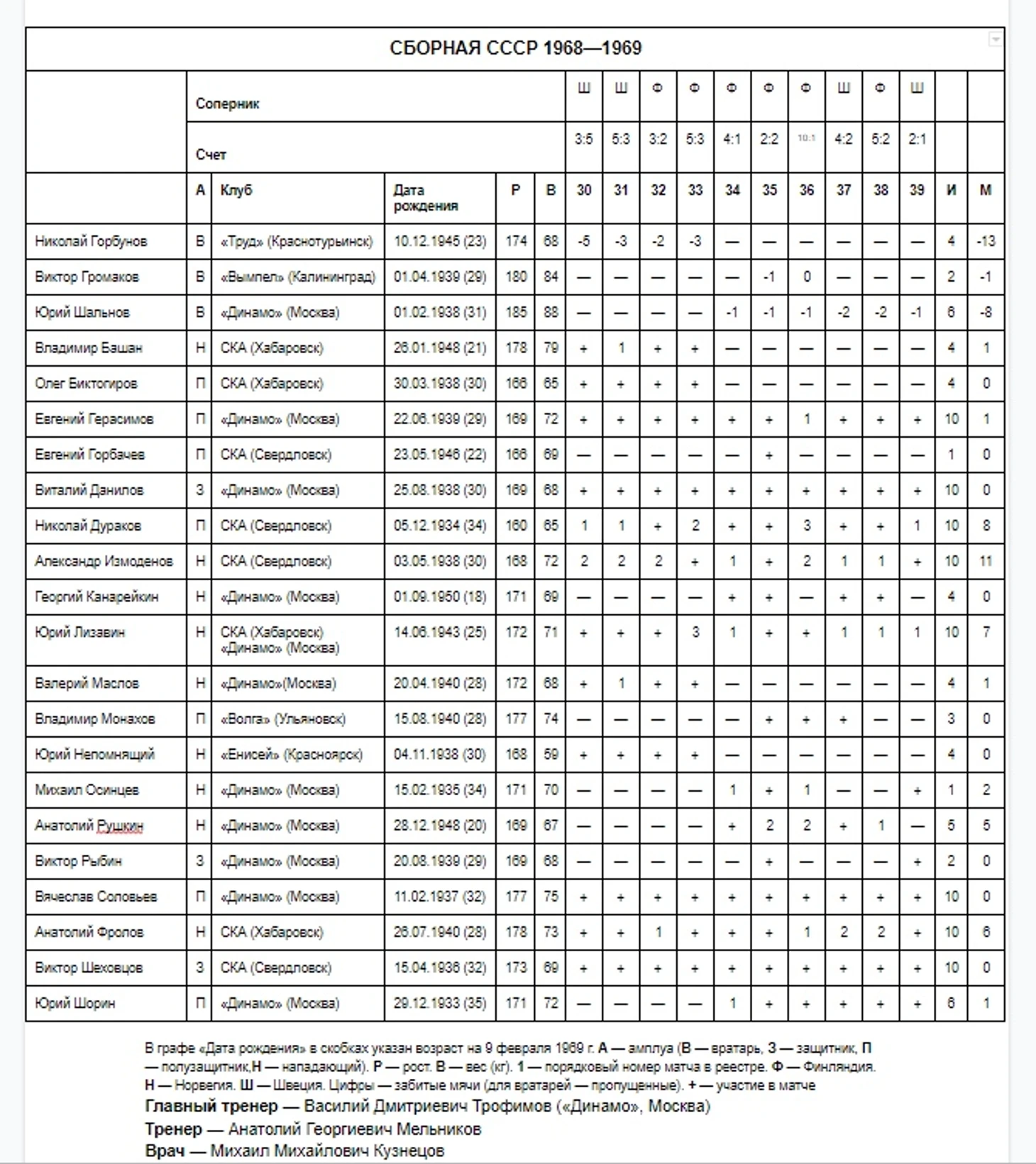 Помогал Трофимову в той поездке (и это был единственный такой опыт) Анатолий Григорьевич Панин, сам в прошлом игрок сборной (8 матчей, 1 мяч; двукратный чемпион мира). С декабря 1966-го — главный тренер хабаровского СКА (до этого он два года был наставником этой команды, но по хоккею с шайбой, причем в этом виде спорта в 60-х поиграл, пусть и всего один матч, в ЦСКА у самого Тарасова!). Четверо хабаровчан в составе и тренер — объективная реальность: в сезоне 1968 года дальневосточные армейцы ни много ни мало боролись за золотые награды XX чемпионата СССР, а второе место уступили московскому «Динамо» по худшей разнице мячей (1. СКА, Свердловск — 44 очка. 2. «Динамо», Москва — 41, +55. 3. СКА, Хабаровск — 41, +49).