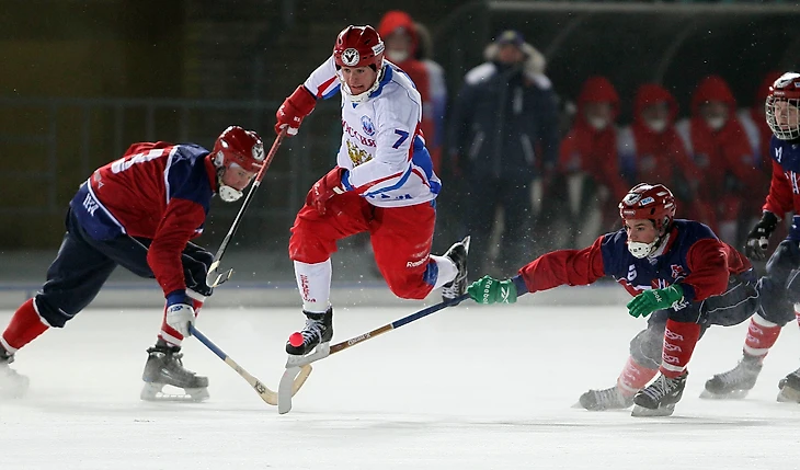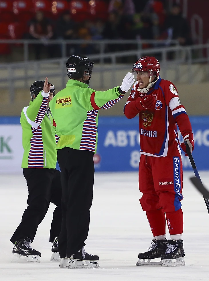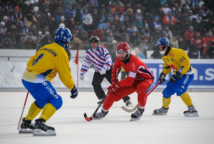 2 февраля 2014. Иркутск, стадион «Труд». Финальный матч XXXIV чемпионата мира Россия — Швеция — 3:2. С мячом — Сергей Ломанов