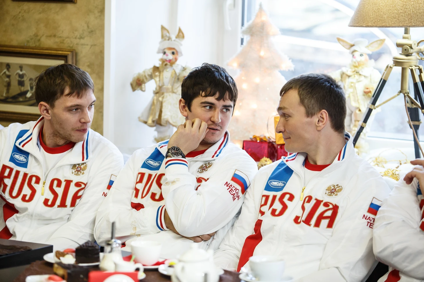 4 апреля 2015. Хабаровск, «Ерофей-Арена». Финальный матч XXXV чемпионата мира Россия —Швеция — 5:3. Только что сборная России стала чемпионом мира. В центре на фото (слева направо): Петр Захаров, Сергей Ломанов, Алексей Чижов