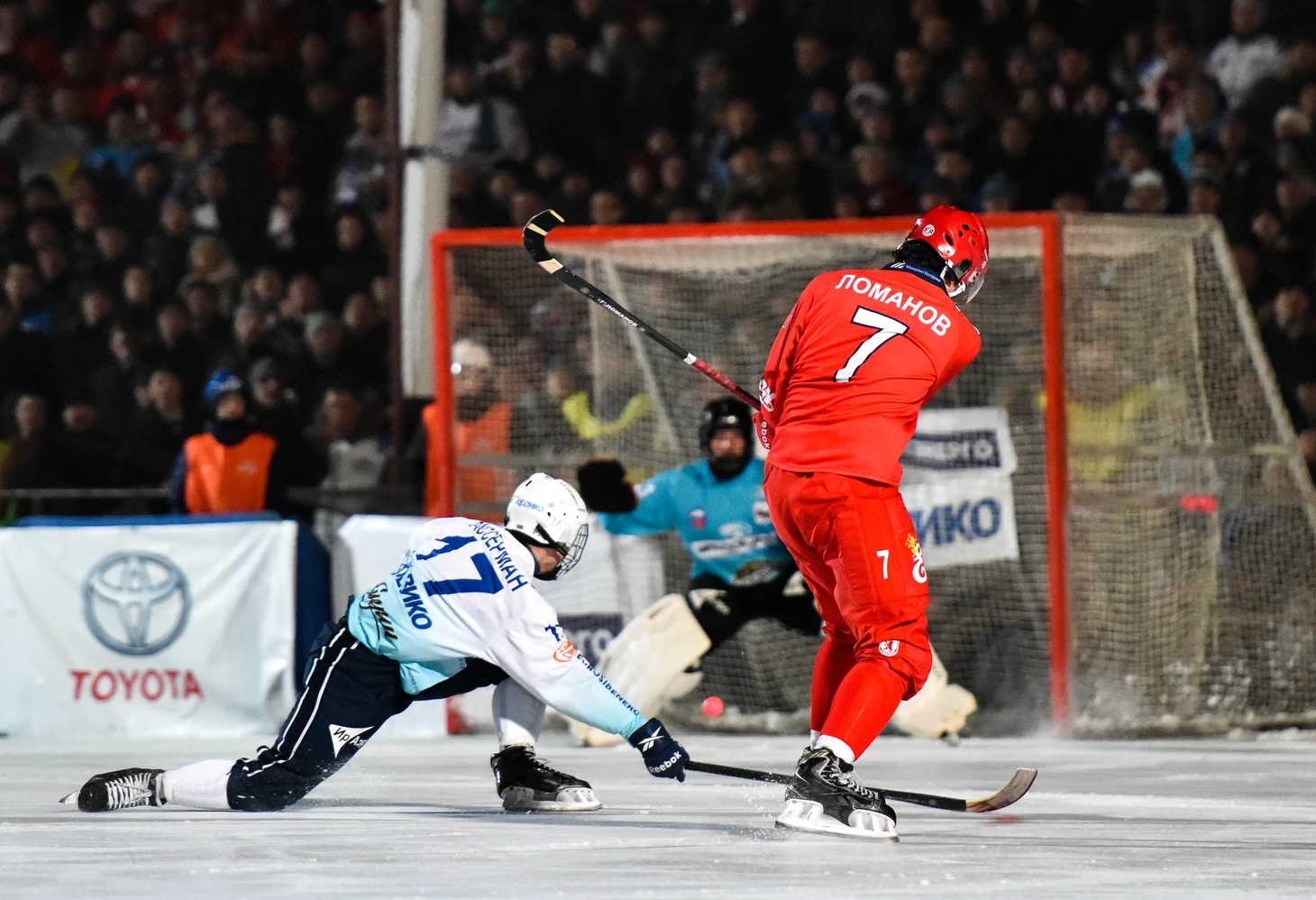 26 марта 2016. Иркутск, стадион «Рекорд». Финальный матч XXIV чемпионата России «Байкал-Энергия» (Иркутск) — «Енисей» (Красноярск) — 1:5. Сергей Ломанов наносит удар по воротам Дениса Рысева из-под клюшки защитника иркутян Игоря Вассермана