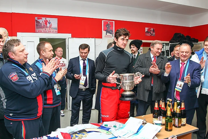 4 апреля 2015. Хабаровск, «Ерофей-Арена». Раздевалка сборной России после финального матча XXXV чемпионата мира Россия — Швеция — 5:3. На переднем плане (слева направо): Владислав Спинка (генеральный менеджер сборной России), Сергей Мяус (главный тренер сборной России), Сергей Ломанов, Владислав Третьяк (знаменитый вратарь сборной СССР по хоккею с шайбой, ныне — президент Федерации хоккея России), Борис Скрынник (президент Федерации хоккея с мячом России)