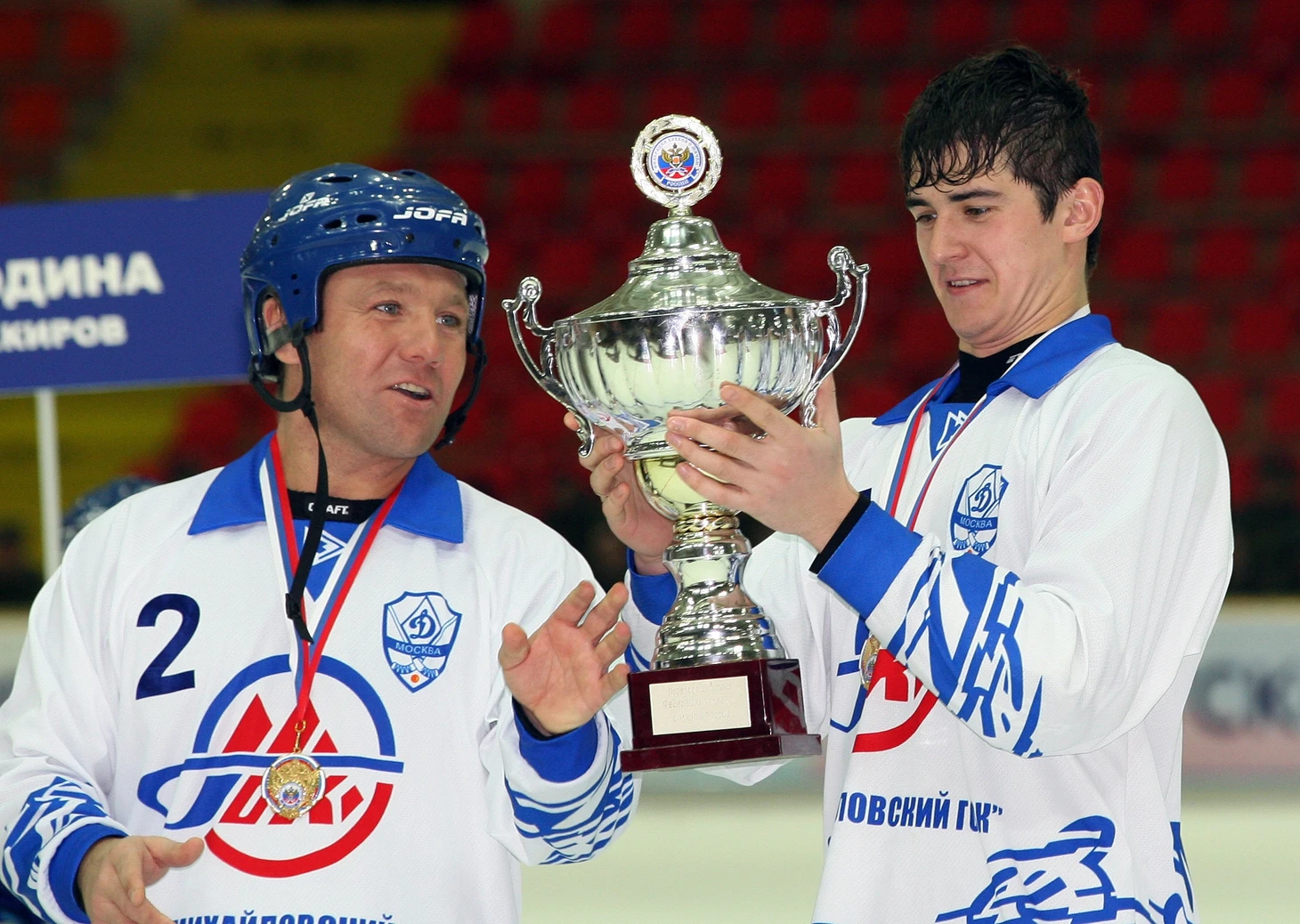 19 марта 2006. Москва, спорткомплекс «Крылатское». Финальный матч XIV чемпионата России «Динамо» (Москва) — «Кузбасс» (Кемерово) — 8:6. Только что Сергей Ломанов впервые стал чемпионом страны в составе московского «Динамо», где он провел три сезона (2005—2008). Слева — нынешний главный тренер сборной России Павел Франц