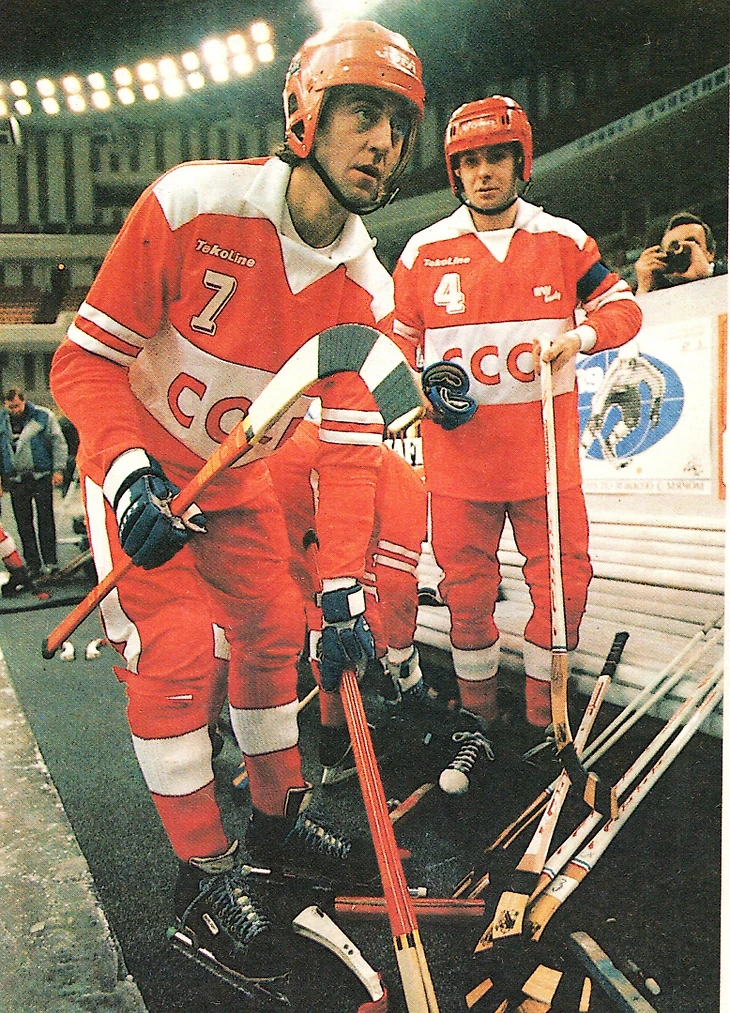 31 января 1984. Кемерово, стадион «Химик». Президент Международной федерации хоккея с мячом (IBF) Григорий Гранатуров вручает приз за победу в X розыгрыше Кубка европейских чемпионов капитану красноярского «Енисея» Виктору Шакалину