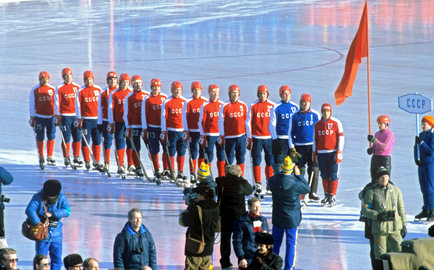 На чемпионате мира 1981 года сборная СССР впервые уступила звание чемпионов мира шведам. 7 февраля 1981. Хабаровск, Центральный стадион им. В. И. Ленина. Сборная СССР на параде открытия XII чемпионата мира (слева направо): Владимир Плавунов, Сергей Лазарев, Александр Господчиков, Сергей Ломанов, Леонид Лобачев, Евгений Великанов, Виктор Шакалин, Александр Рычагов, Владимир Корытин, Виталий Савлук, Александр Цыганов, Виталий Ануфриенко, Валерий Эйхвальд, Валерий Бочков, Александр Першин