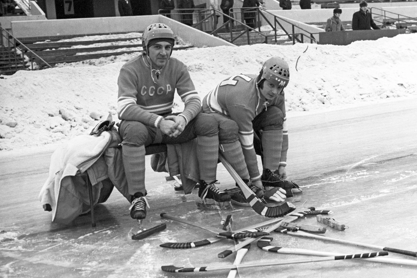 16 февраля 1973. Москва, стадион «Динамо». Игроки сборной СССР Леонид Палладий и Георгий Канарейкин накануне старта VIII чемпионата мира