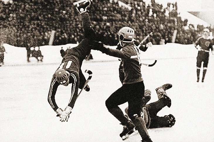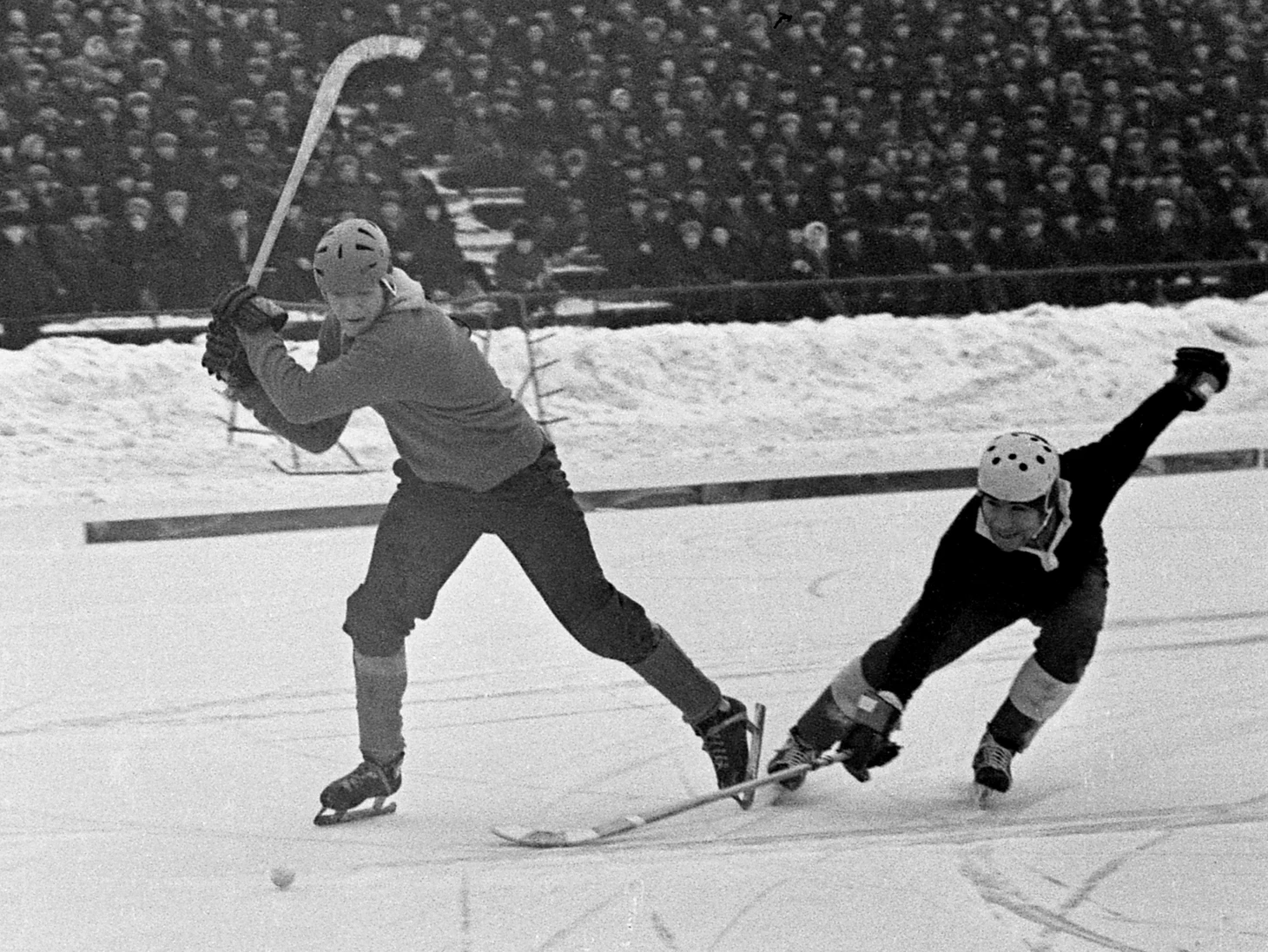 24 января 1971. Иркутск, стадион «Труд». Матч XXIII чемпионата СССР «Локомотив» (Иркутск) — СКА (Свердловск) — 4:6. Атаку свердловского армейца Владимира Тарасевича пытается прервать иркутянин Андрей Комарицын