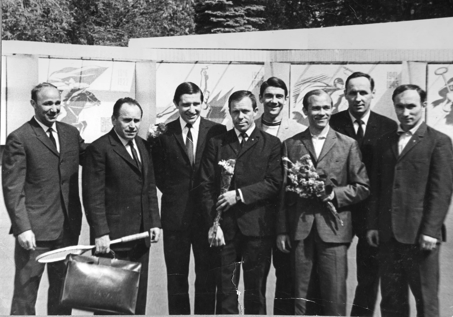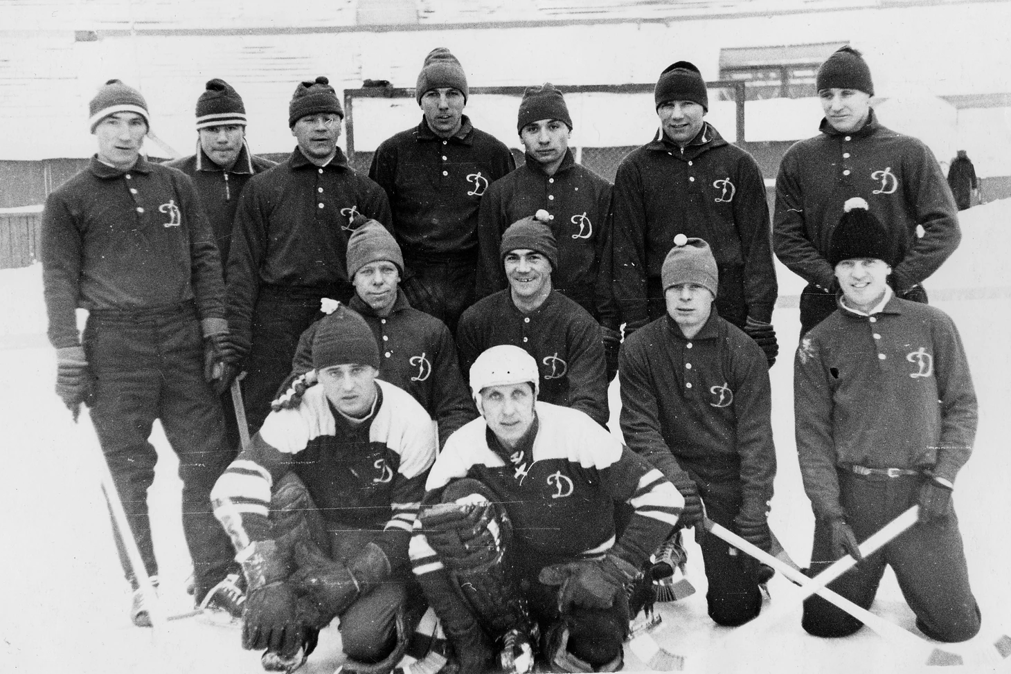 Хоккеисты и тренеры московского «Динамо» после встречи в подшефном трудовом коллективе. Слева направо: Михаил Осинцев, Василий Дмитриевич Трофимов, Валерий Меслов, Евгений Герасимов, Вячеслав Соловьев, Виталий Данилов, Анатолий Мельников, Юрий Шорин