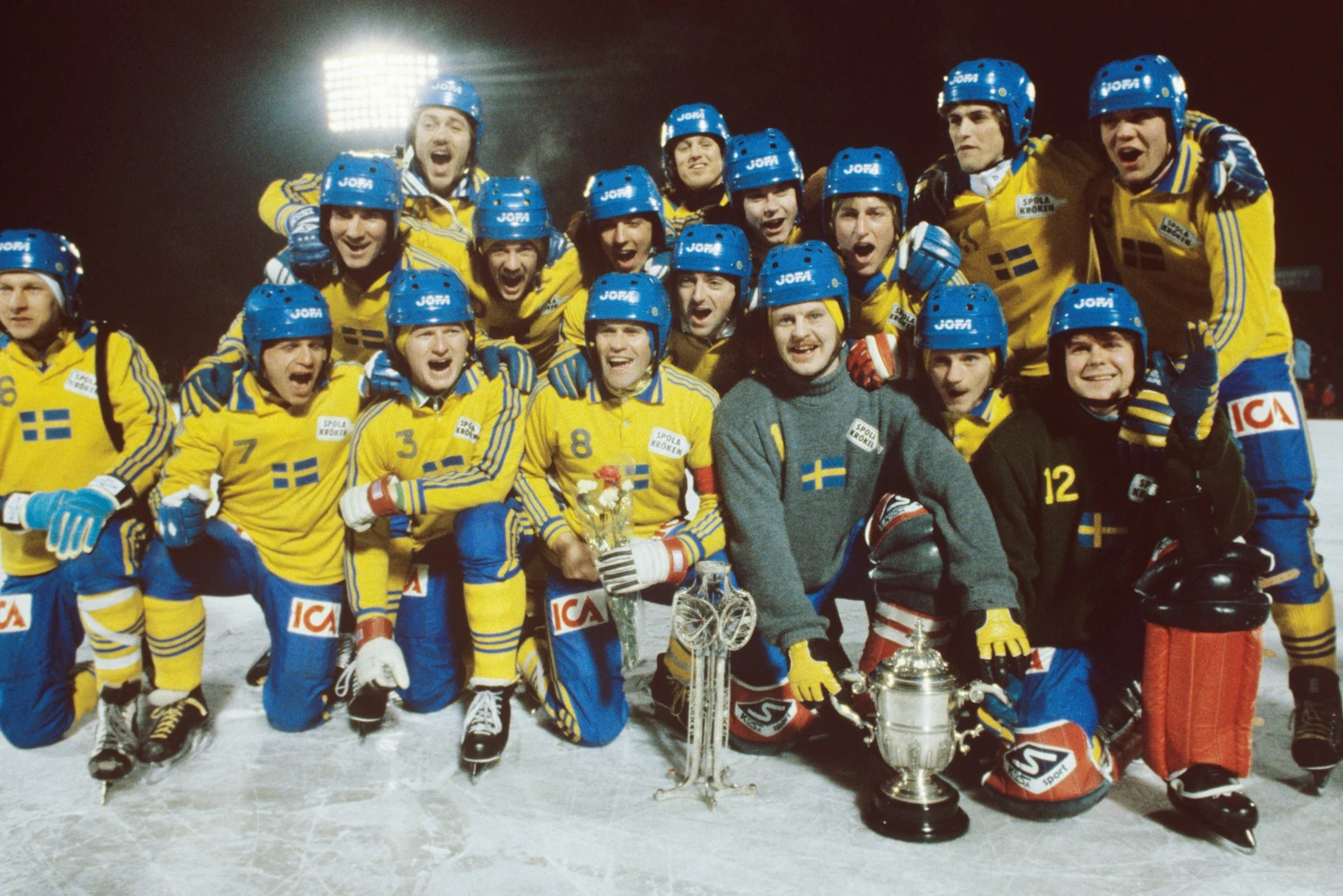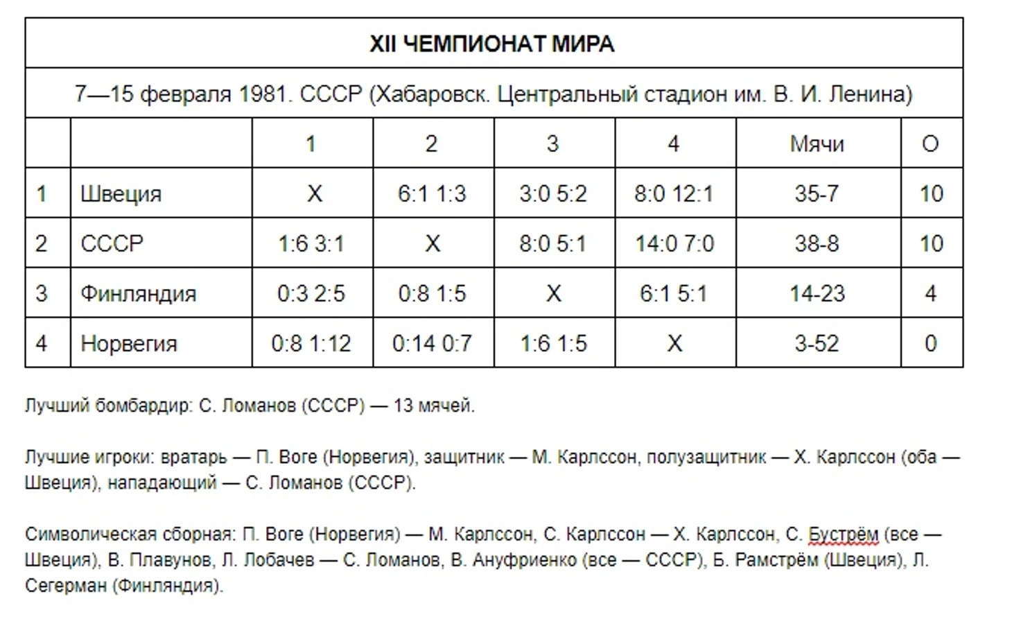 15 февраля 1981. Хабаровск, центральный стадион им. В. И. Ленина. Сборная Швеции — чемпион мира. Первый ряд (слева направо): Хокан Карлссон, Бенгт Рамстрём, Ларс-Уве Шёдин, Сёрен Бустрём (капитан), Томас Франссон, Кристер Чельквист, Юрген Юханссон. Второй ряд (слева направо): Бенгт Карлссон, Микаэль Арвидссон, Андерс Сёдерхольм, Матс Карлссон, Ларс Онгстрём, Пер Тогнер, Кент Бьёрк, Ян-Эрик Кальберг, Ула Юханссон, Стефан Карлссон