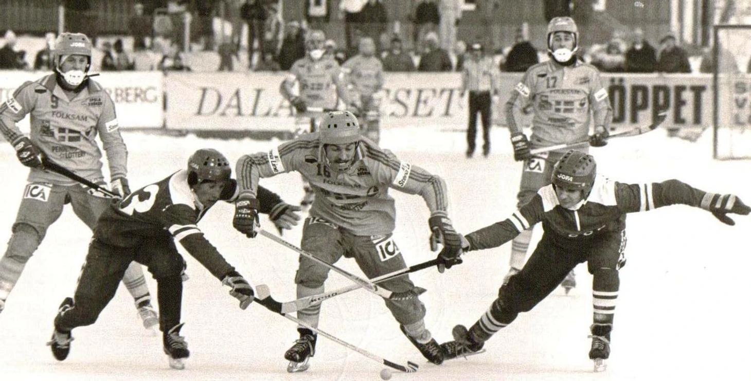 10 февраля 1995. Осло, стадион «Валле Ховин». Финальный матч XIV чемпионата мира СССР — Швеция — 5:4 (в овертайме). Напору шведского нападающего Микаэля «Микки» Арвидссона противостоят игроки сборной СССР Ирик Фасхутдинов (слева) и Виктор Шакалин. На заднем плане игроки шведской сборной Пер Тогнер (№ 9) и Ханс-Элис «Хассе» Юханссон (№ 17)