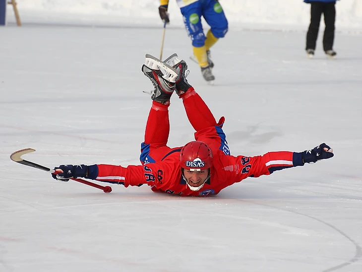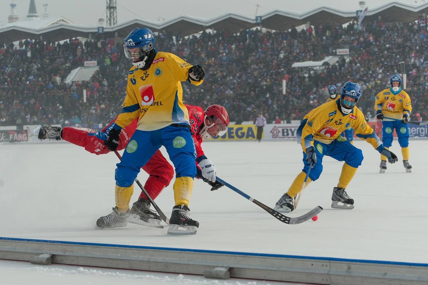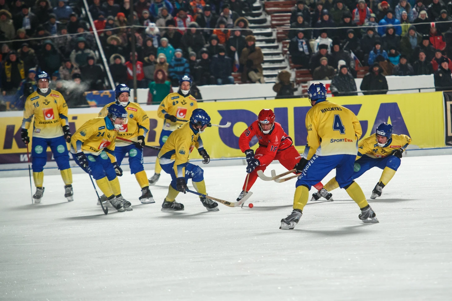 Участники финального матча не стали тратить время на разведку — с первых же минут пошла игра на встречных курсах, на высочайших скоростях, с обилием острых моментов и с жесткими единоборствами на каждом клочке ледяного поля. Шведы первыми добились успеха — Даниэль Берлин завершил затяжной розыгрыш углового. А через пару минут Петр Захаров заставил ликовать трибуны, без шансов для вратаря исполнив 12-метровый удар — 1:1. Вот тут-то шведы, похоже, в полной мере ощутили, каково это — находиться в кратере вулкана! А когда по секторам стадиона «Труд» покатилась знаменитая «волна», растерялись, кажется, даже скандинавские операторы, которые не знали, что им снимать — желто-красную феерию на поле или клокочущую чашу стадиона.