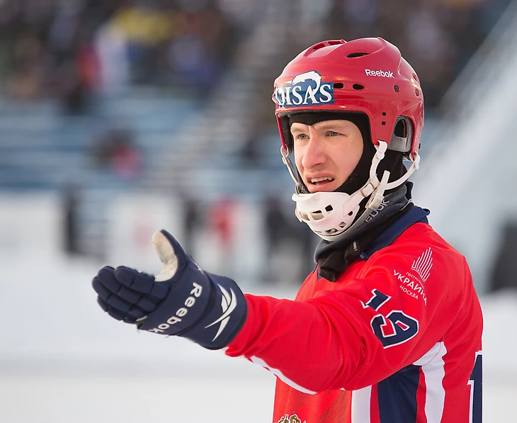 2 февраля 2014. Иркутск, стадион «Труд». Финальный матч XXXIV чемпионата мира Россия — Швеция — 3:2. Полузащитник российской сборной Алексей Бушуев пытается преодолеть оборону шведов по правому флангу