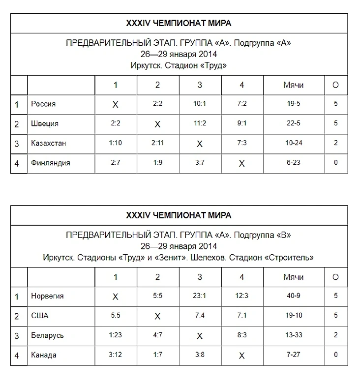 Норвегия — Финляндия — 2:9. США — Казахстан — 3:11. Швеция — Беларусь — 33:5.