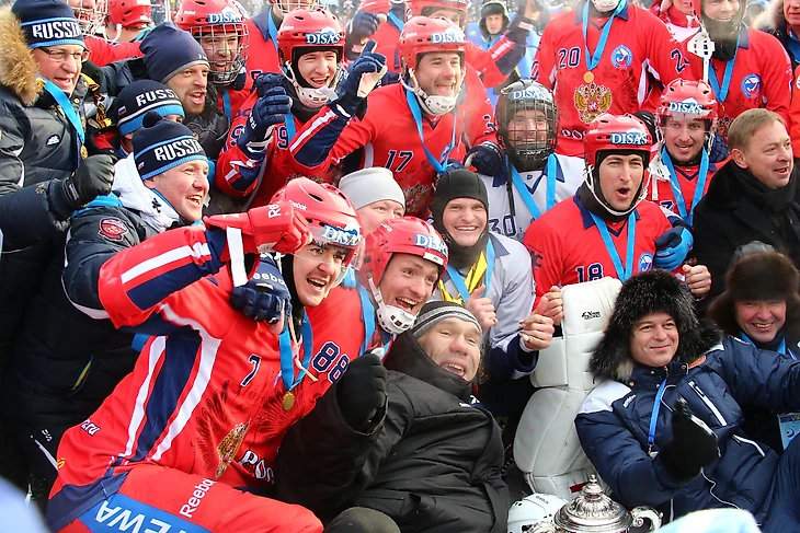 2 февраля 2014. Иркутск, стадион «Труд». Только что закончился финальный матч XXXIV чемпионата мира Россия — Швеция — 3:2. Сборная России стала чемпионом мира в 22-й раз. Первый ряд (лежат): Николай Валуев, Максим Кастырин (директор по развитию ФХМР). Второй ряд: Сергей Ломанов, Евгений Иванушкин, Александр Конанов, Роман Черных, Сергей Шабуров. Третий ряд: Андрей Пашкин, Павел Франц, Александр Егорычев, Игорь Ларионов, Янис Бефус, Дмитрий Савельев, Денис Рысев, Алексей Бушуев, Александр Тюкавин