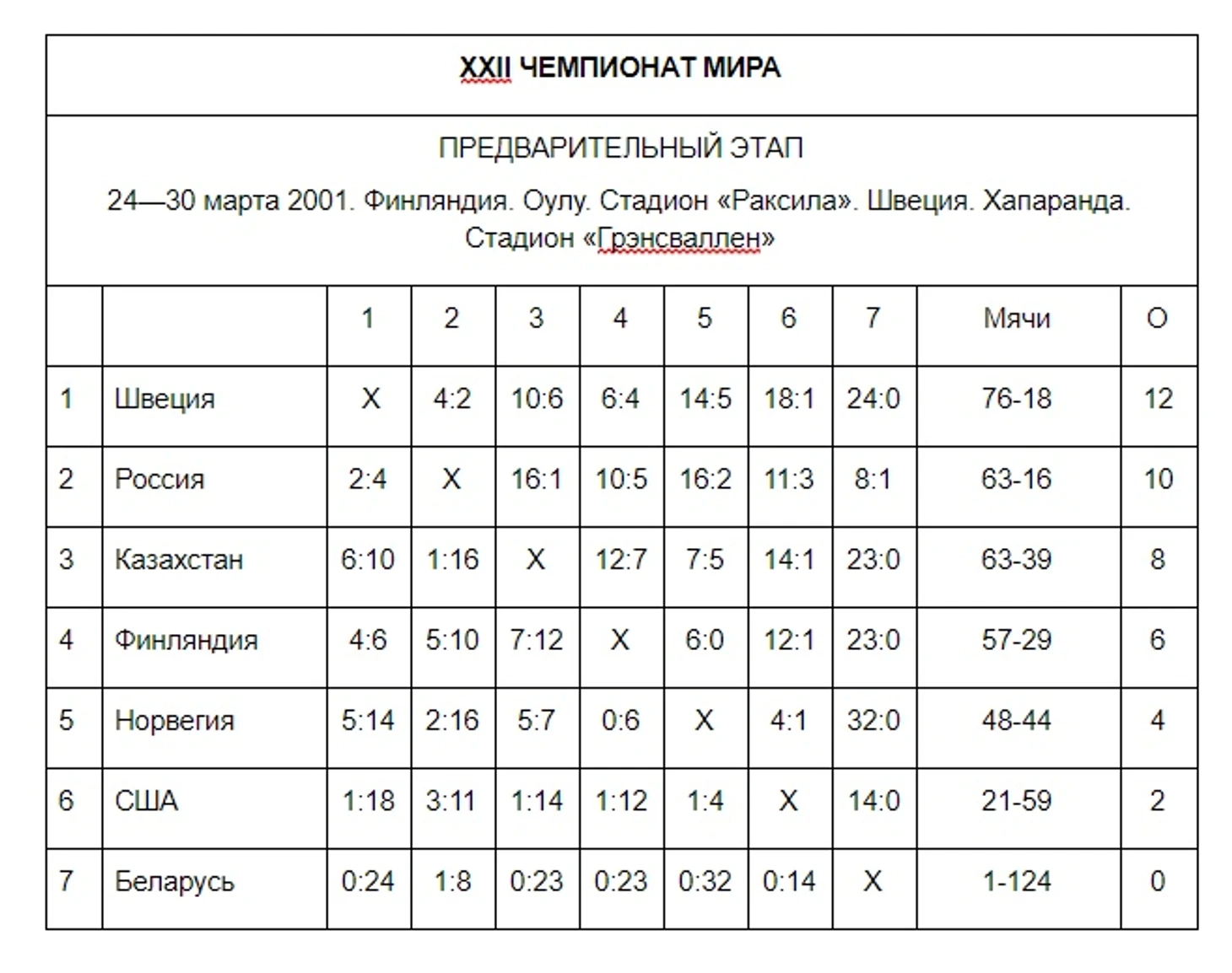 В 2001 году сборная страны начала подготовку к стартующему 24 марта (рекордно позднее начало!) в Финляндии первому чемпионату мира XXI века с двух январских встреч со сборной Швеции в Сандвикене и Фалуне. 12 января проиграли 3:5, а через два дня выиграли 5:2. Словом, без сенсаций. Примечательным стало разве то, что в этих встречах впервые примерил форму национальной сборной 22-летний полузащитник из «Водника» Дмитрий Савельев, будущий девятикратный чемпион мира.