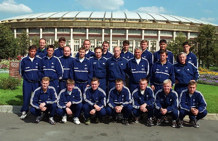 2000 год. Сборная России в«Лужниках». Первый ряд (слева направо): Алексей Мясоедов, Евгений Швецов, Павел Франц, Николай Ярович, Александр Тюкавин, Юрий Погребной, Олег Хайдаров. Второй ряд: Ринат Шамсутов, Михаил Свешников, Александр Киреевич Цыганов (тренер), Валерий Грачев, Владислав Анатольевич Спинка (менеджер), Андрей Стук, Владимир Владимирович Янко, Игорь Леонидович Ануфриев (массажист), Борис Михайлович Сапроненков (врач). Третий ряд: Вячеслав Рябов, Сергей Ломанов, Игорь Гапанович, Сергей Обухов, Андрей Золотарев, Олег Чубинский, Ильяс Хандаев, Максим Чермных