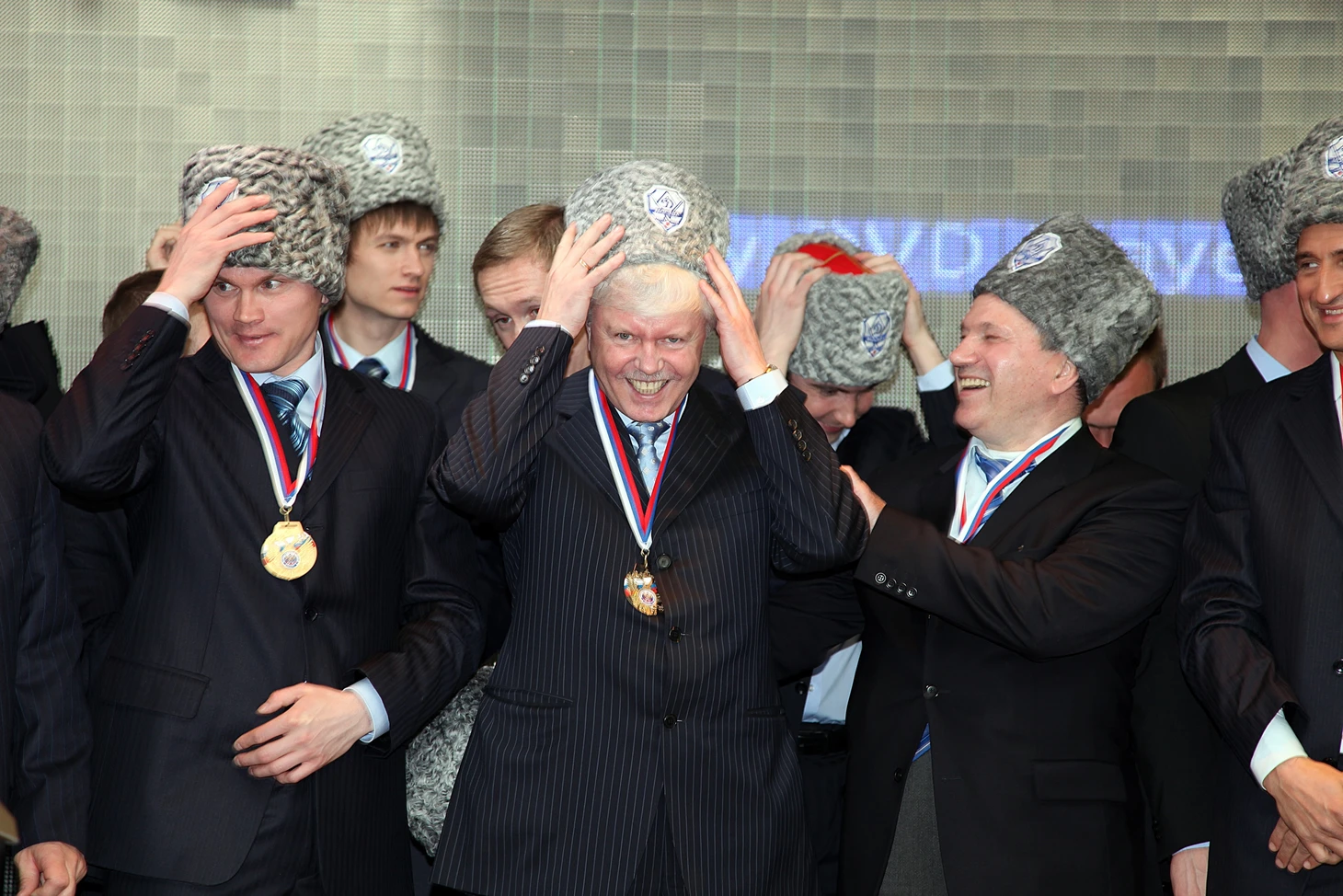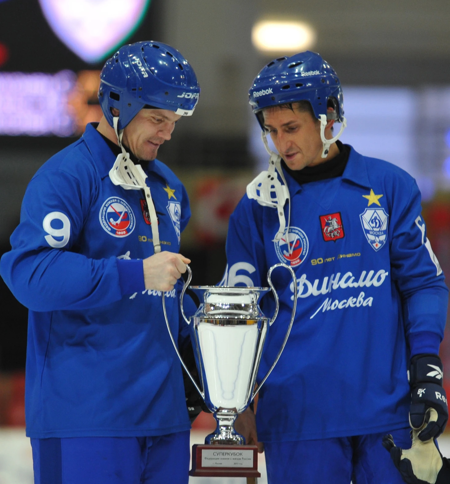 24 апреля 2009. Москва, «Крокус Сити Холл». Награждение хоккеистов московского «Динамо» за победу в XVII чемпионате России по хоккею с мячом. На фото слева направо: Александр Тюкавин, Дмитрий Стариков, Иван Максимов, Николай Барышников (президент хоккейного клуба «Динамо»), Кирилл Хвалько, Виктор Еремин (администратор «Динамо»)