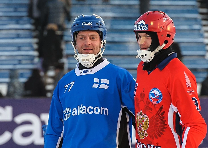 1 февраля 2014. Иркутск, стадион «Труд». Полуфинальный матч XXXIV чемпионата мира Россия — Финляндия — 3:1. Друзья-соперники. Александр Тюкавин и лидер финской сборной Сами Лаакконен
