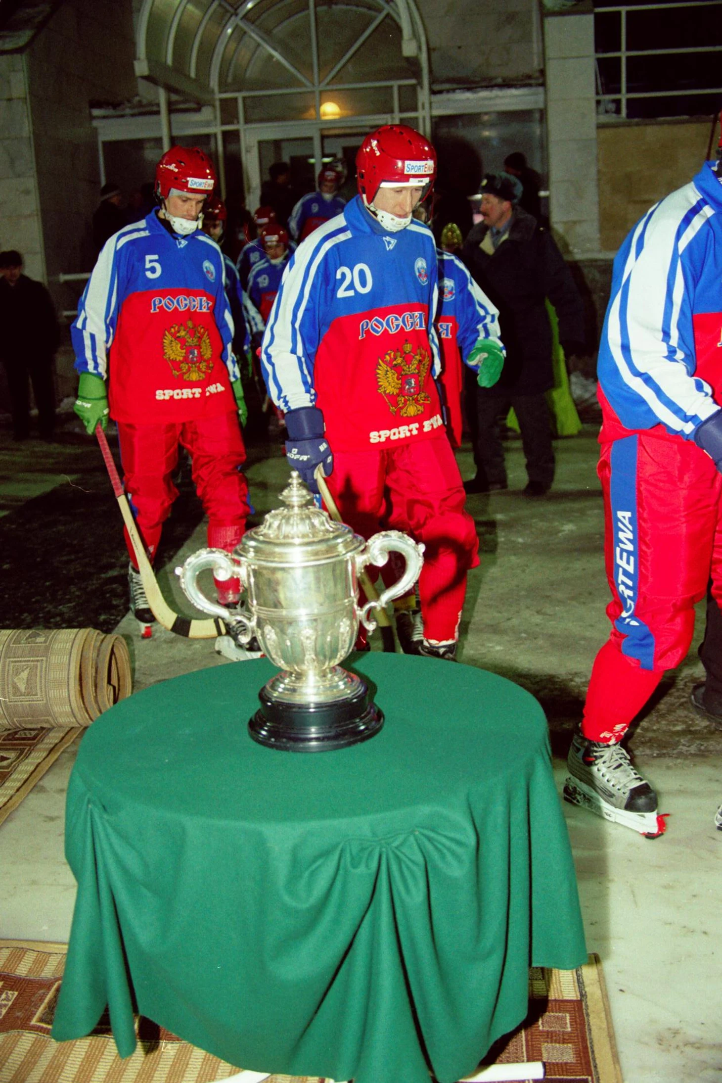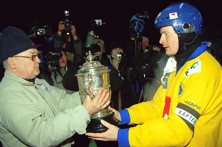 6 февраля 2005. Казань, стадион «Ракета». Президент Международной федерации хоккея с мячом (FIB) Альберт Поморцев вручает кубок победителя мирового первенства капитану сборной Швеции после окончания финального матча XXV чемпионата мира Россия — Швеция — 2:5
