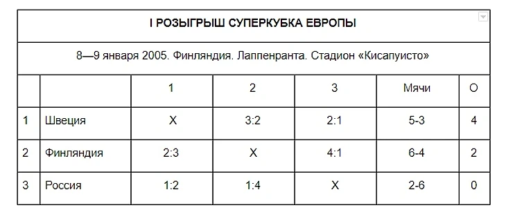 В январе в Финляндии впервые разыграли Суперкубок Европы. За громкой вывеской скрывался блиц-турнир трех сильнейших в мире хоккея с мячом сборных команд. Сборная России выступает откровенно экспериментальным составом (на чемпионат мира попадут только пятеро — Гейзель, Иванушкин, Чермных, Шабуров, Мясоедов). На старте играем тяжелейший (с овертаймом) матч со Швецией. Открыв счет на 12-й минуте, шведы выстроили столь вязкую оборону, что российской сборной весь матч не удавалось ее взломать. Лишь на 89-й минуте дебютант сборной Иванушкин сравнивает счет. Разрешилось все на 27-й минуте — увы, не в нашу пользу.
