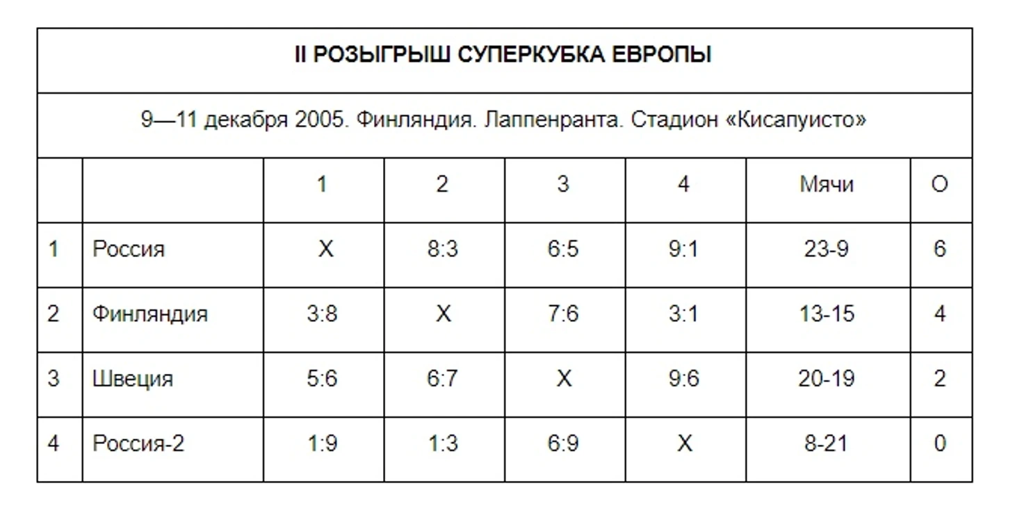 В стартовом матче II розыгрыша Суперкубка Европы первая сборная легко расправилась с молодежной командой — 9:1. Со шведами матч случился просто-таки сумасшедший. Острейшая борьба была все 90 минут (первый мяч залетел в ворота на 3-й минуте — 1:0, Тюкавин, последний на 88-й минуте забил П. Нильссон), но многочисленные удаления и подуставший соперник позволили в концовке выйти вперед — 6:5. Тем не менее новый главный тренер шведов Андерс Якобссон резюмировал: «Мы провели хороший матч, особенно его вторую половину. Если так же сыграем и на чемпионате мира, успех обеспечен». В матче с Финляндией, как на качелях, отыграли первые 40 минут (3:3 к 38-й), но затем уверенно оторвались — 8:3.