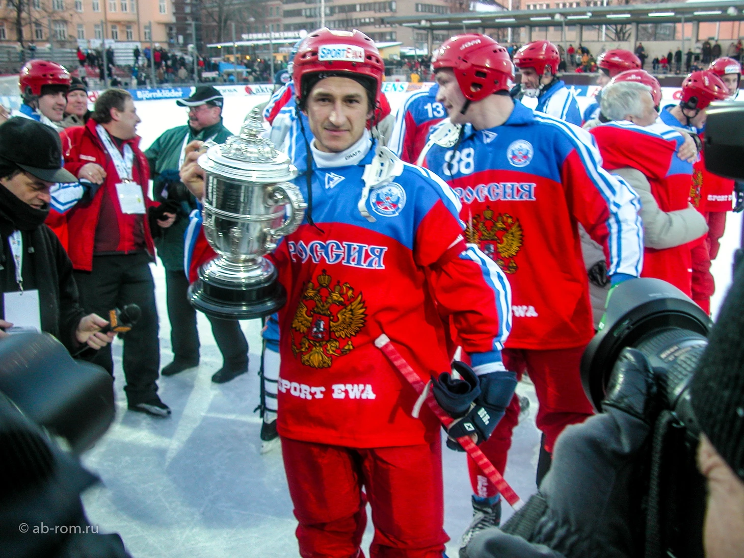 6 февраля 2006. Стокгольм, стадион «Зинкенсдамм». Капитан сборной России Михаил Свешников с кубком победителя первенства планеты после окончания финального матча XXVI чемпионата мира Россия — Швеция — 3:2