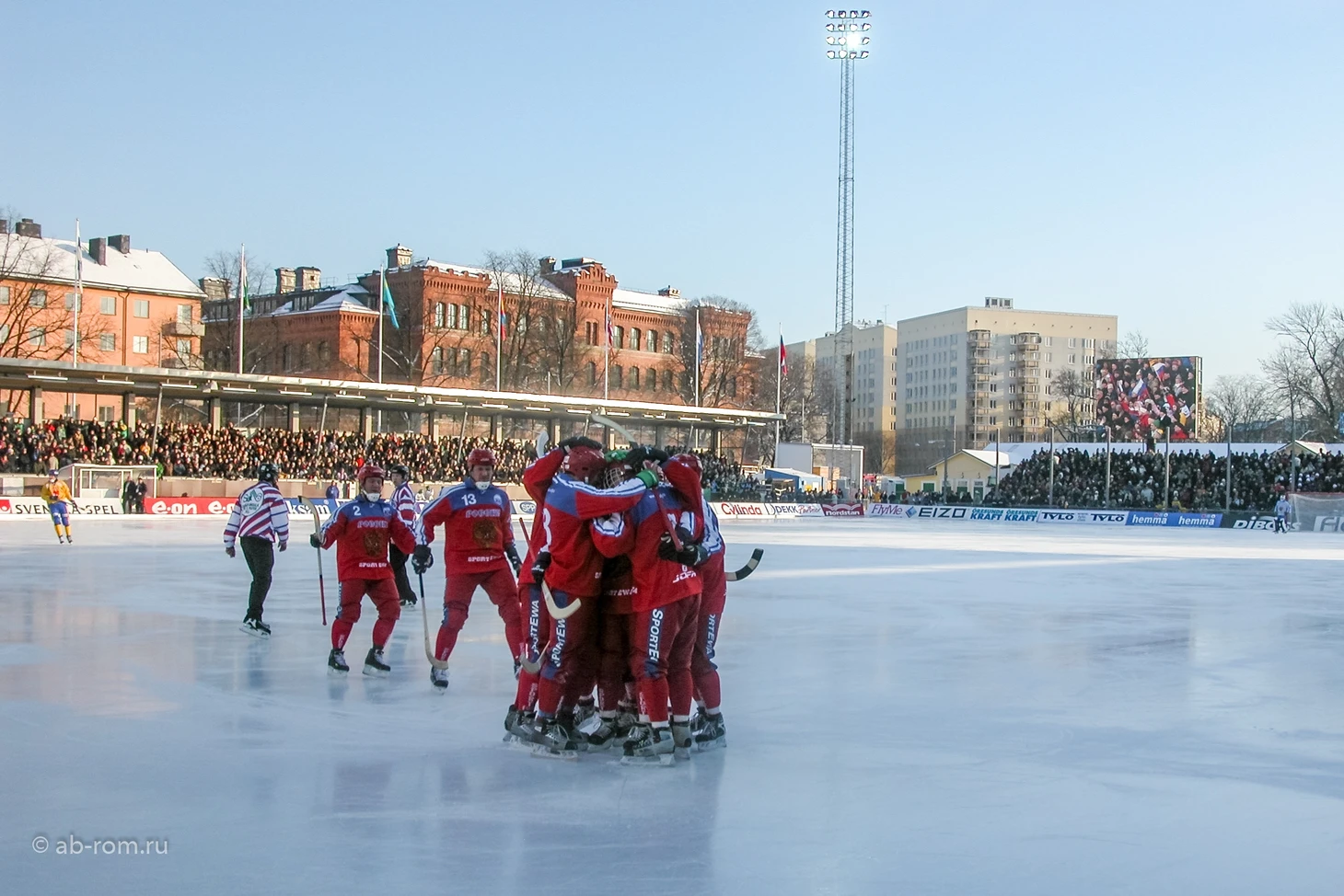 6 февраля 2006. Стокгольм, стадион «Зинкенсдамм». Хоккеисты сборной России празднуют первый забитый мяч в ворота соперника в финальном матче XXVI чемпионата мира Россия — Швеция — 3:2