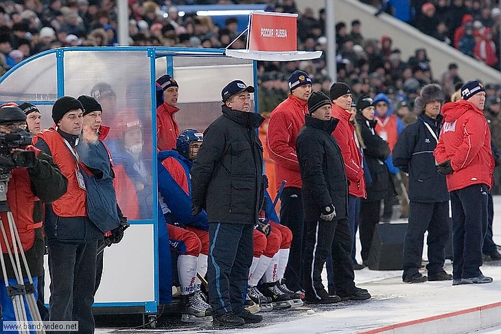 4 февраля 2007. Кемерово, стадион «Химик». Скамейка сборной России во время финального матча XXVII чемпионата мира Россия — Швеция — 3:1. В центре — главный тренер сборной России Сергей Ломанов